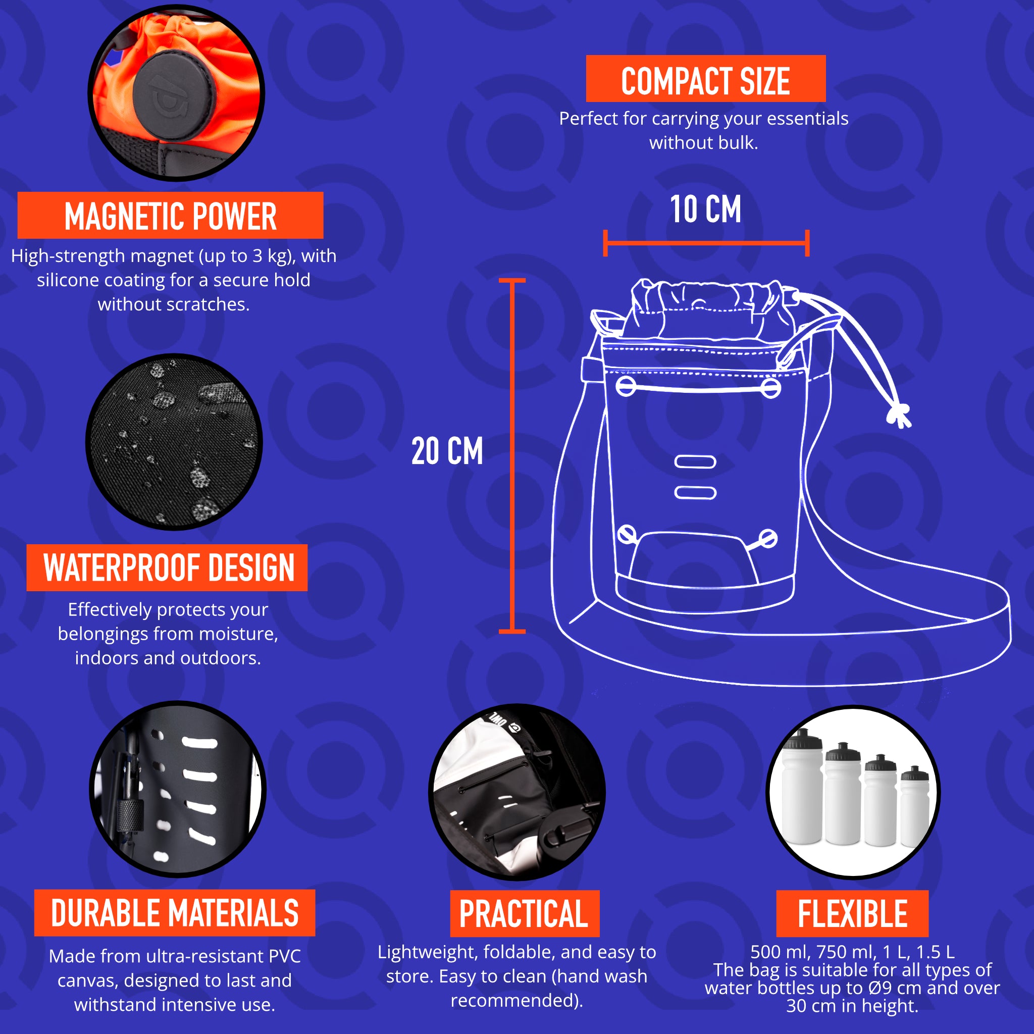 No more stress ! Simply attach your Magnetic Pouch to any metal surface — the ultra-strong magnet keeps your bottle and essentials secure and within reach